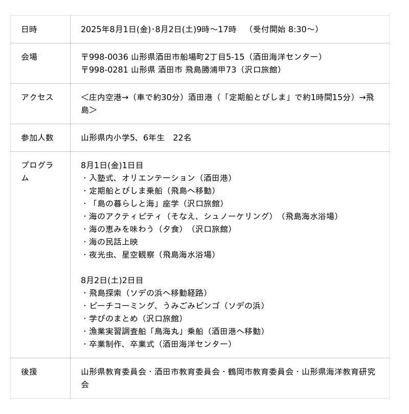 一般社団法人海と日本プロジェクトin山形は、2025年8月1日(金) ・8月2日(土) に「やまがた海洋塾2025~飛島探検隊~」を開催いたしました。このイベントは、次世代へ豊かで美しい海を引き継ぐために、海を介して人と人とがつながる“日本財団「海と日本プロジェクト」”の一環です。