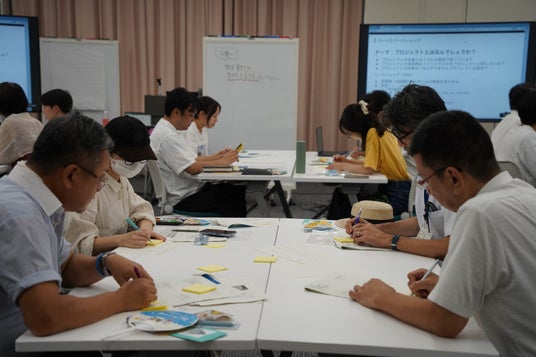 講座の前半のワークショップでは、プロジェクトの定義や具体例、会議の定義や具体例などを4人1組となってチームの意見をまとめました。