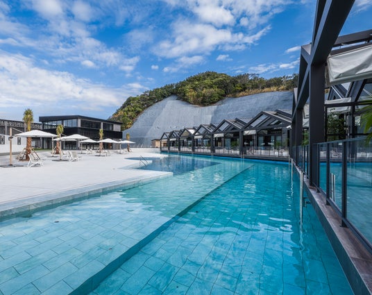 32~35℃ と年中入れる温泉プールは客室からそのまま入水可能な部屋もあり、2025年には