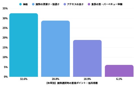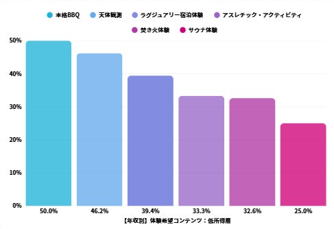 低所得層では「本格BBQ」への関心が50.0%と他の層(67-68%)より大幅に低く、より堅実で確実性の高い体験を好む傾向が見られます。