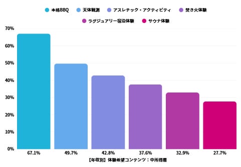 特に「本格BBQ」への関心の高さ(68.3%)は、高所得層が単なる宿泊ではなく、能動的な体験を重視していることを示しています。また、「サウナ体験」への関心が他の層より高いのは、リラクゼーションと健康志向の表れと考えられます。
