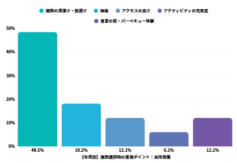 所得層によって、グランピング施設を選ぶ際の優先順位が劇的に異なることが判明しました。