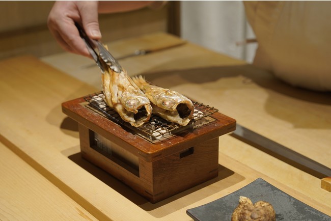 ・ノドクロの焼き物 葡萄の木の香り:お客様の目の前で葡萄の木と炭でノドクロを燻して香りづけ