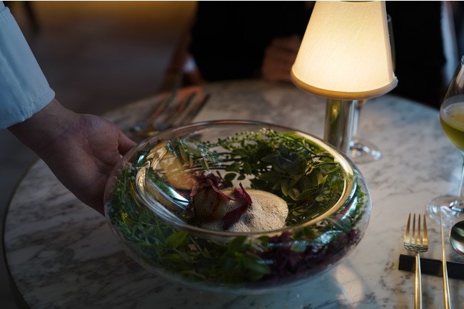 コースの内容は季節によって異なりますが、8月は「とうもろこしのすりながし」「鮎のリエット」「ノドクロの焼き物 葡萄の木の香り」「旬の魚の握り」など夏らしいメニューに加えて、メインは1階のダイニングのシグニチャーメニューである「黒毛和牛グリル 古代塩添え」を、デザートは南国のフルーツを使った「マンゴーとパッションフルーツのムース」を提供します。また、日本酒やワインなどソムリエが料理に合わせて選んだドリンクでペアリングも楽しめます。落ち着いたバー、華やかなメインダイニング、隠れ家のような地下の鮨処、そして緑豊かなオープンエアのテラスと雰囲気の変化を感じながら様々な料理を堪能できる、いつもとは一味違ったレストラン体験はいかがでしょうか。