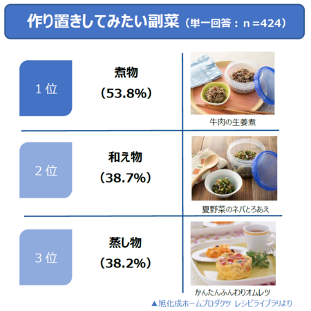 作り置きに挑戦してみたい副菜の結果をみると、第1位は、「煮物(53.8%)」、第2位は「和え物(38.7%)」、第3位は「蒸し物(38.2%)」がランクインしました。