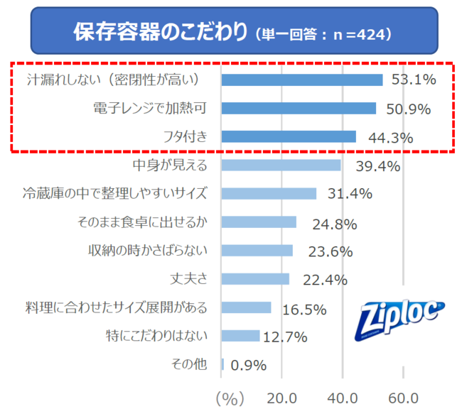 また、作り置きした副菜などの保存容器のこだわりについて聞くと、「汁漏れしない(密閉性が高い)(53.1%)」、「電子レンジで加熱可(50.9%)」、「フタ付き(44.3%)」などがあげられました。
