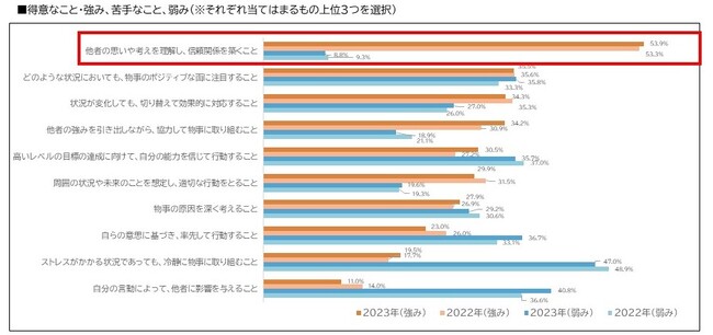 「自身の得意なこと・強み」として、「他者の思いや考えを理解し、信頼関係を築くこと」を選択した新入社員が53.9%で、2位以下と18.4%差がありました。