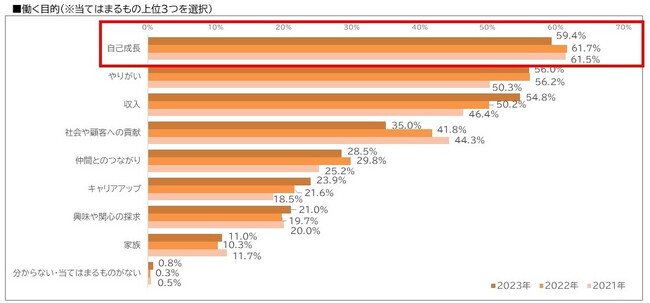 「働く目的」として「自己成長」を選択した新入社員が59.4%、「働くにあたって楽しみなこと」として、「新たな知識・スキルが身につくこと」を選択した新入社員が61.9%を占めました。