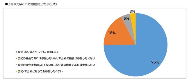 公式・非公式にかかわらず、上司や先輩との交流機会に参加したいと回答した新入社員は、全体の75%に達しました。