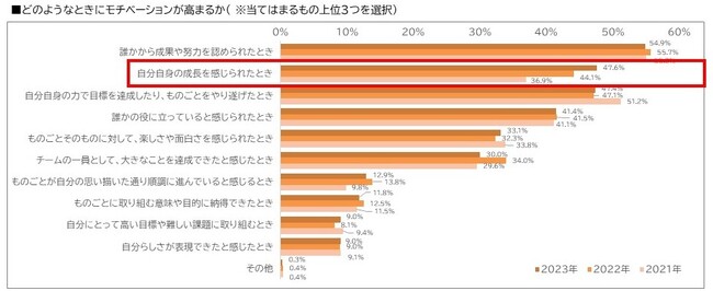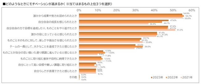 「どのようなときにモチベーションが高まるか」で選択された割合が高い項目の上位3つが、 「誰かから成果や努力を認められたとき」「自分自身の成長を感じたとき」「自分自身の力で目標を達成したり、ものごとをやり遂げたとき」(2022年と同様の3項目)となりました。