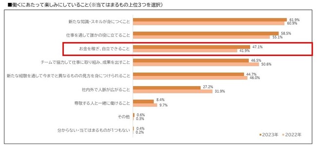 また、「働くにあたって楽しみなこと」として、「お金を稼ぎ、自立できること」の選択した新入社員の割合は、2022年と比較して5%以上上昇しました。