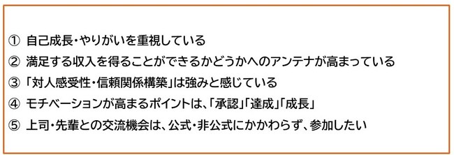 …新入社員は他者との関係構築を強みと認識し、職場でのコミュニケーションも前向きであるため、さまざまな人と関係構築や雑談できるような機会を意図的に作っていく
