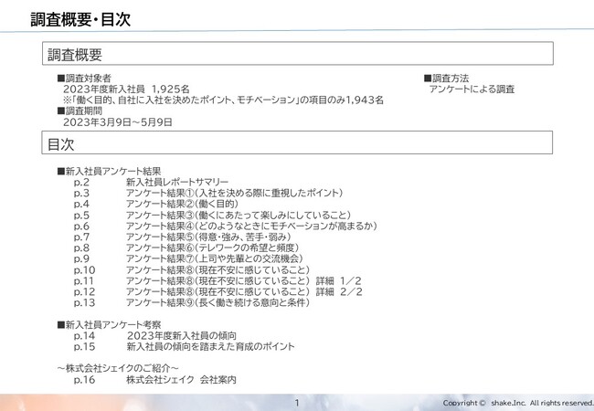 企業研修、人事組織コンサルティング事業を行う株式会社シェイク(本社:東京都千代田区/代表取締役社長:吉田実)は、2023年度新入社員の傾向を理解し、職場での活躍を後押しするために、・入社を決める際に重視したポイント・働く目的・働くにあたって楽しみにしていること・どのようなときにモチベーションが高まるか・自分自身の強み、弱み・上司や先輩との交流機会といった設問でアンケート調査を行い、分析・考察のうえで「2023年度入社 新入社員レポート」を発行いたしました。本プレスリリースでは、アンケート結果を抜粋してご紹介いたします。