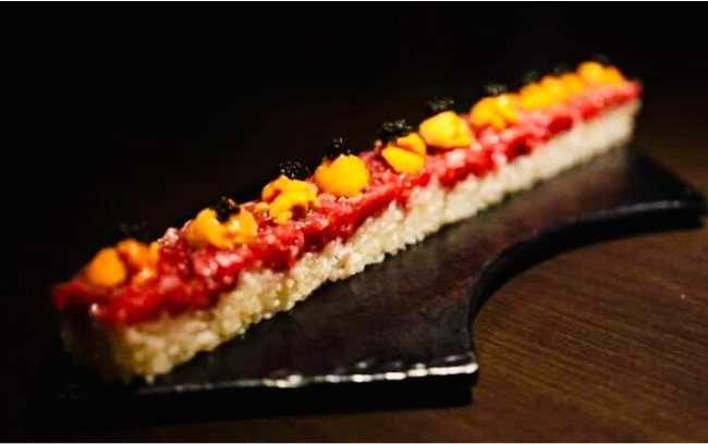 当店のユッケ寿司は、炙った牛肉ユッケの上に、雲丹とキャビアを美しく飾り贅沢に仕上げました。
