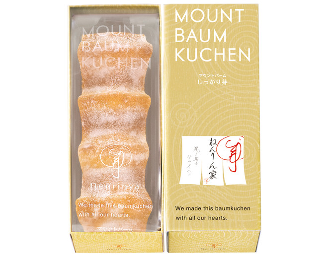 ねんりん家の代表作。?はカリッ、中はしっとり熟成の「マウントバーム しっかり芽」。濃厚なバター風味の生地を、独自の窯で長時間じっくり焼きあげておいしさを引き出した、こだわりのバームクーヘンです。