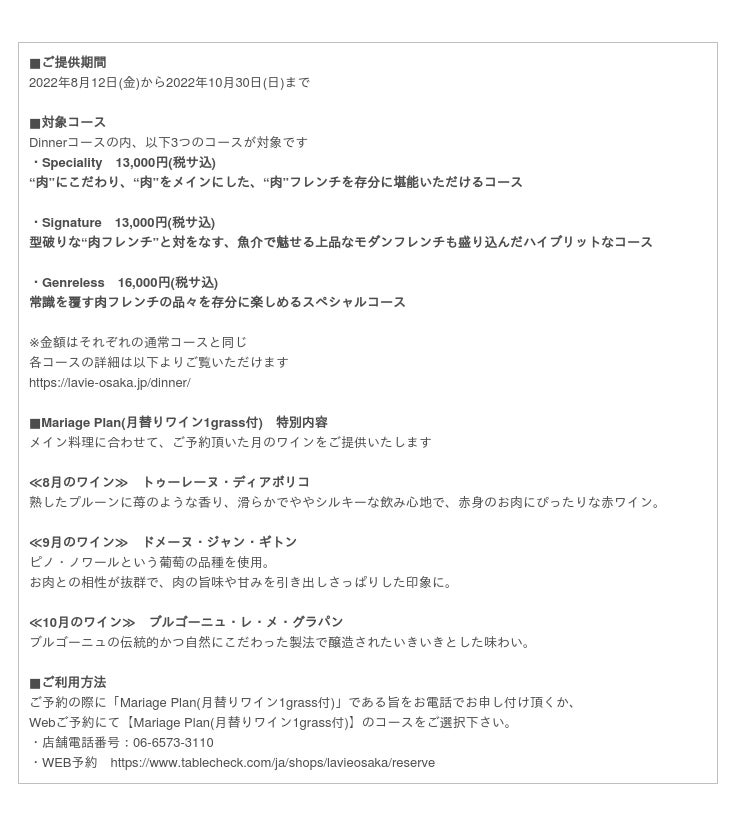 2022年8月12日(金)より、ソムリエが厳選した肉フレンチにふさわしい赤ワインを、2022年10月30日(日)まで月替わりでメインの料理に合わせてサービスする『Mariage Plan(月替りワイン1grass付)』を販売致します。