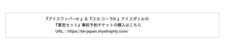 約3年ぶりとなる海開きを迎えた今年。ぜひバーガーキング(R) の期間限定ポップアップストアにお越しいただき、ここでしか食べられない『アイスワッパー(R) 』と『コカ·コーラ(R) 』アイスボトルの『夏恋セット』を大切な人と一緒にお召し上がりください。