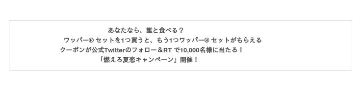 内 容:バーガーキング(R) でワッパー(R) セットを1つ買うと、もう1つワッパー(R) セットがもらえる