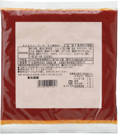 「ネクストシーフード うに風味W」は、うに枯渇による価格高騰を受けて開発した次世代シーフードで、魚のすり身で生うにの濃厚な味わいとなめらかな舌触りを再現した商品です。