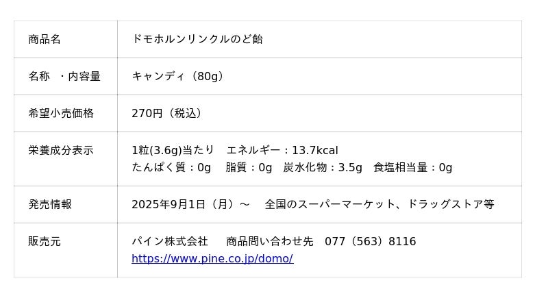 株式会社再春館製薬所(本社:熊本県上益城郡益城町、代表取締役社長:西川正明 以下、再春館製薬所)とパイン株式会社(本社:大阪市天王寺区、代表取締役社長:上田真弘)は、累計出荷数307万個を誇る共同開発商品「ドモホルンリンクルのど飴」<ライチ味>の好評を受け、二度目のリニューアルを実施いたします。基礎化粧品「ドモホルンリンクル」の肌ケア技術から生まれ、うるおいの発想を活かして開発されたのど飴の“3代目”となる同商品は、2025年9月1日(月)より全国のスーパーマーケット、ドラッグストア等で順次発売されます。