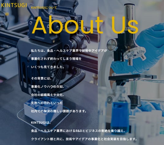 当社は、企業の技術やアイデアの事業化を伴走するサービス「KINTSUGI」を主軸としながら、現在自社でも「こころの健康を実現する食品・サービス」を開発中です。