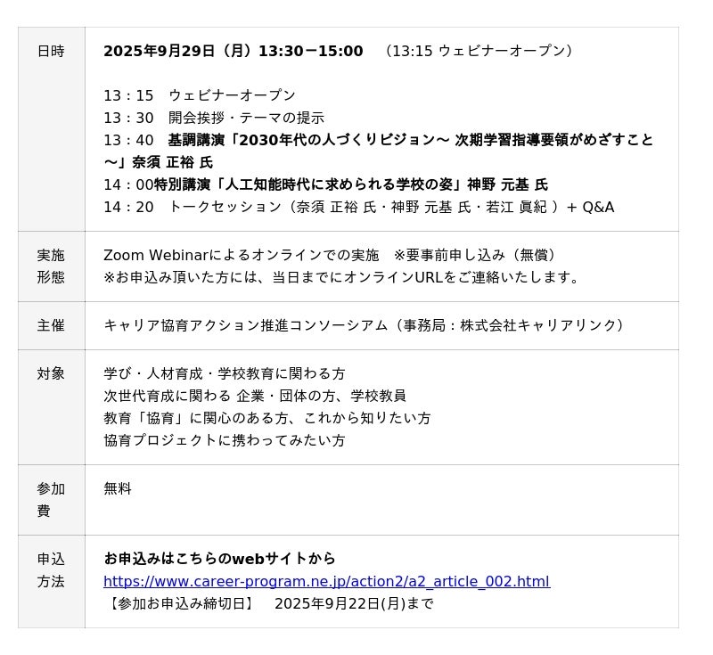 教員、企業、NPO、地域など、立場や世代をこえて「協育=ともに育つ」ことを推進するキャリア協育アクション推進コンソーシアムは、2025年9月29日(月)に協育アクションフォーラム『“協育”で挑む、2030年代の社会を創る人づくり』を開催いたします。