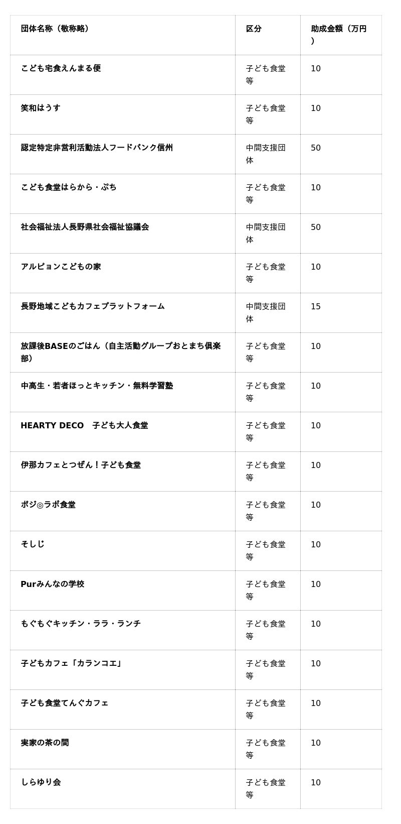 短期間の募集期間にもかかわらず、長野県内各地から多数のご応募をいただき、助成団体として19団体(子ども食堂等:16件、中間支援団体:3件)を選出いたしました。惜しくも不採択となった団体もございましたが、選考にあたっては慎重な検討を重ねました。