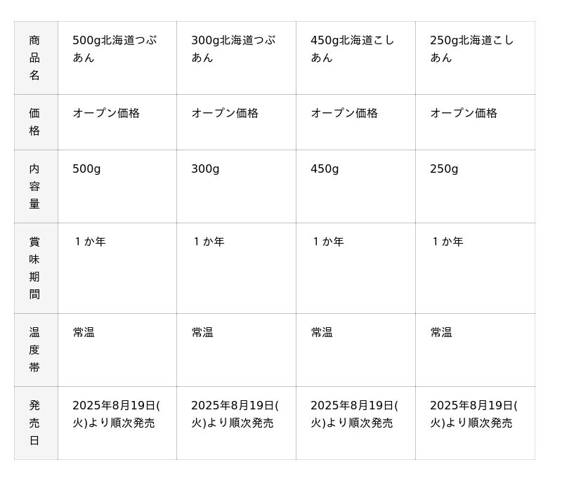 井村屋株式会社(本社:三重県津市高茶屋七丁目1番1号、社長:岩本 康)は、『北海道つぶあん』『北海道こしあん』シリーズのリニューアル・ラインアップ追加を行い、2025年8月19日(火)より発売します。