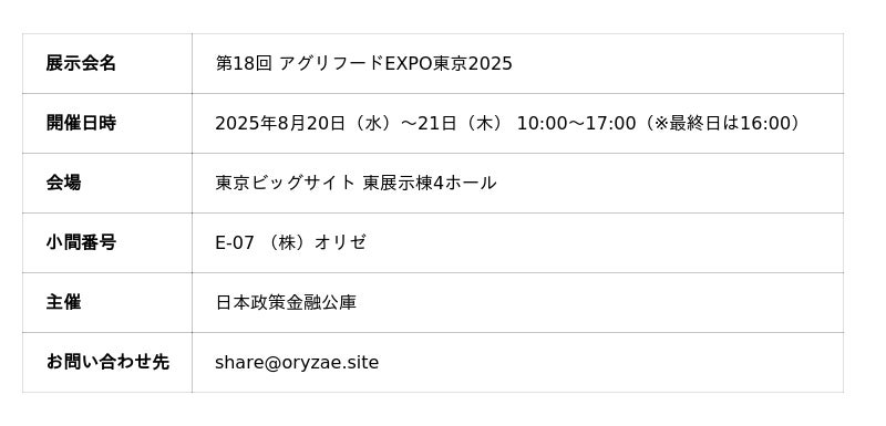 日本の伝統発酵技術を用いて社会課題解決を目指す株式会社オリゼ(本社:東京都渋谷区、代表取締役:小泉泰英)は、2025年8月20日(水)~21日(木)の2日間、東京ビッグサイトで開催される「第18回 アグリフードEXPO東京2025」に初めて出展いたします。