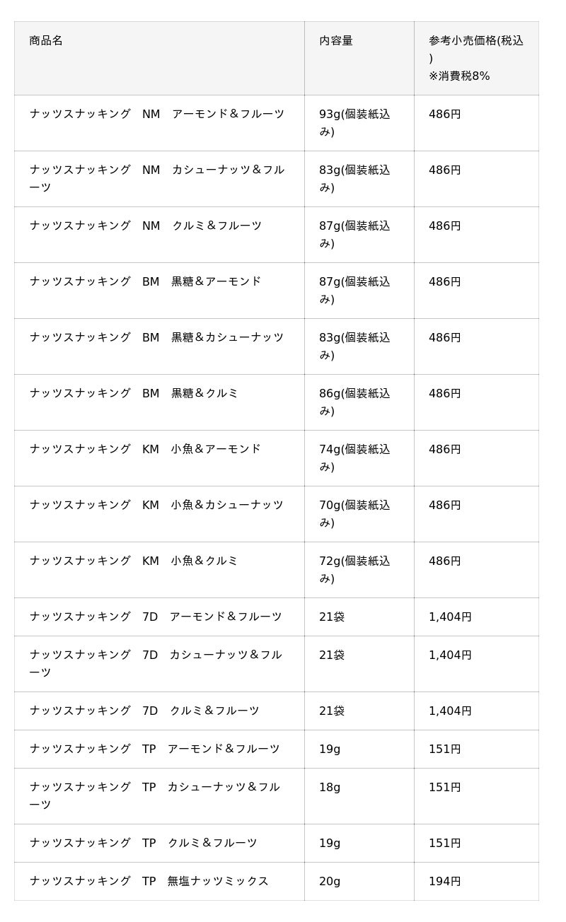 - 『NM ナチュラルミックス』のみ、21袋入りで1週間分の間食が楽しめる大容量サイズ『7D セブンデイズ』、まずは気軽に一袋から試しやすい食べきりサイズ『TP たべきりパック』など、用途に合わせた内容量のバリエーションを展開