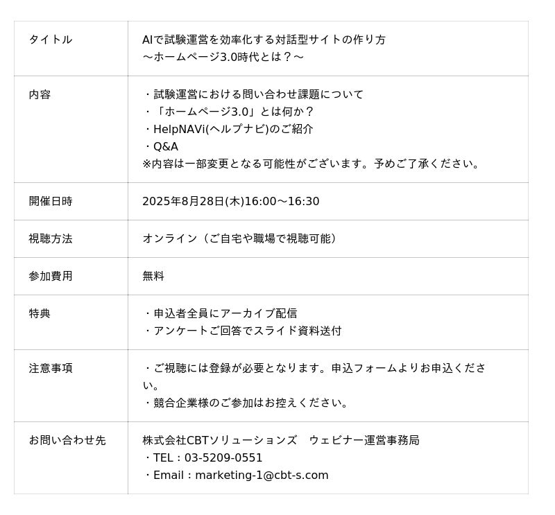 CBT・IBT試験等の試験運営業務をメイン事業とする株式会社CBTソリューションズ(本社:東京都千代田区、代表取締役社長:野口功司、以下CBTS)は、2025年8月28日(木)16:00~16:30に無料セミナー「AIで試験運営を効率化する対話型サイトの作り方~ホームページ3.0時代とは?~」を開催いたします。