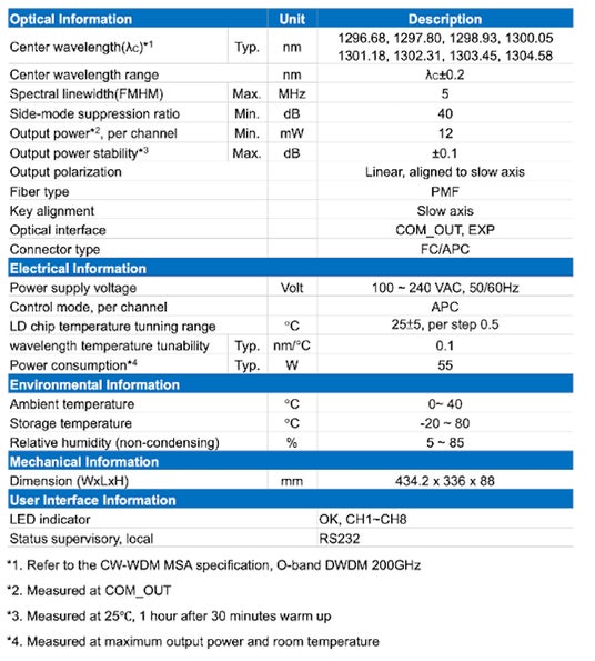 本製品は、CW-WDM MSA規格に準拠した200 GHz間隔のDWDMチャネルを備えたO-band対応のレーザー光源ユニットで、1296.68 nm~1304.58 nmの8波長を1筐体に内蔵したオールインワン構成となっております。各チャネルで12 mW以上の出力、5 MHz以下の狭線幅、40 dB以上のサイドモード抑制比(SMSR)、±0.1 dBの高い出力安定性を実現。偏波保持ファイバ(PMF)による高直線偏光出力と、前面パネルに搭載されたLEDインジケータによる状態監視機能を備え、光部品検査、光学測定システムでの使用に最適です。