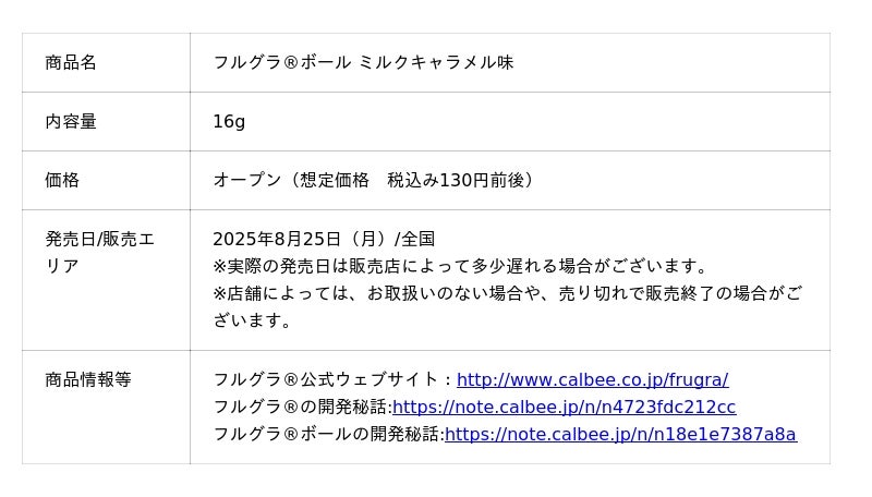 カルビー株式会社(本社:東京都千代田区、代表取締役社長兼CEO:江原 信)は、シリアルブランド売上No.1※1の「フルグラ(R)」がひとくちサイズにまるくなった「フルグラ(R)ボール」と、森永製菓株式会社(本社:東京都港区、代表取締役社長 COO:森 信也、以下「森永製菓」)の展開する「森永ミルクキャラメル」が初めてコラボレーションした新商品『フルグラ(R)ボール ミルクキャラメル味』を2025年8月25日(月)より全国で発売します。