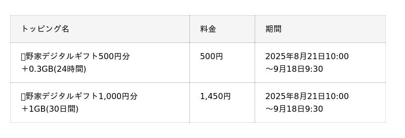 「吉野家デジタルギフト500円分」と「0.3GB(24時間)」のセットを500円、「吉野家デジタルギフト1,000円分」と「1GB(30日間)」のセットを1,450円で提供します。