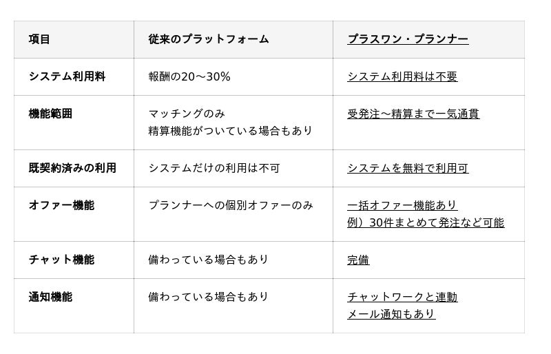 プラスワンプランナーは、単なるマッチングサイトではなく「業界の共通インフラ」になるようにとの想いで、2018年から7年間の実績を踏まえて誕生しました。以下の革新的な優位性があります。業界初の完全システム利用料不要のビジネスモデル