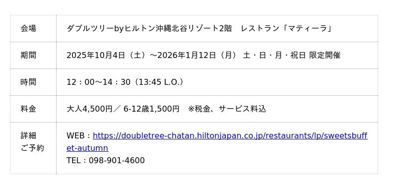 【2025年8月21日】ダブルツリーbyヒルトン沖縄北谷リゾート(北谷町(ちゃたんちょう)美浜(みはま) 統括総支配人 宍倉裕(ししくらゆたか))は、2025年10月4日(土)から2026年1月12日(月)まで、2階レストラン「マティーラ」にてランチ&スイーツビュッフェ『白銀の森と魔女の鏡』を開催いたします。