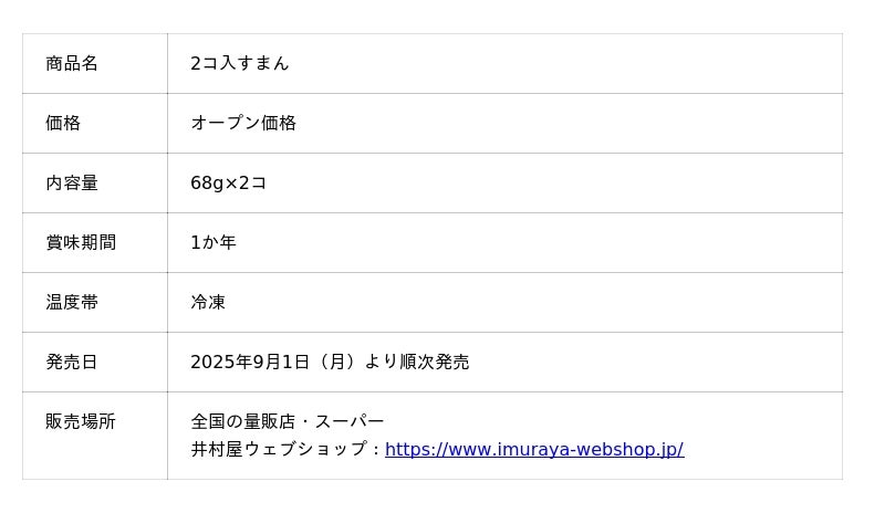 井村屋株式会社(本社:三重県津市高茶屋七丁目1番1号、社長:岩本 康)は、SNSで話題を集めた具なしの“素(す)の中華まん”「すまん」を、よりお試しいただきやすい2コ入パッケージへ変更、さらに動物性原料不使用へリニューアルし、2025年9月1日(月)より全国で期間限定発売します。