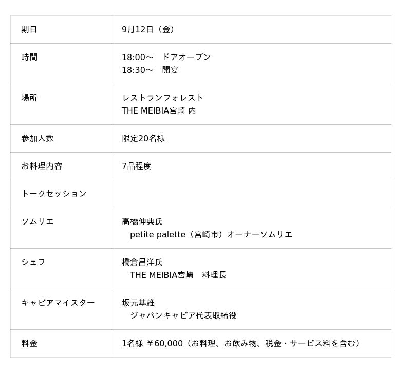 THE MEIBIA宮崎(宮崎・宮崎市、橋倉昌洋シェフ)9月12日(金)に、EXCLUISIVE GALA DINNER 2025として、キャビアの魅力を存分にお楽しみいただける『宮崎キャビア1983』シリーズをふんだんに使用したフルコースの最高峰を表現した、一夜限りの特別なディナーパーティーを開催