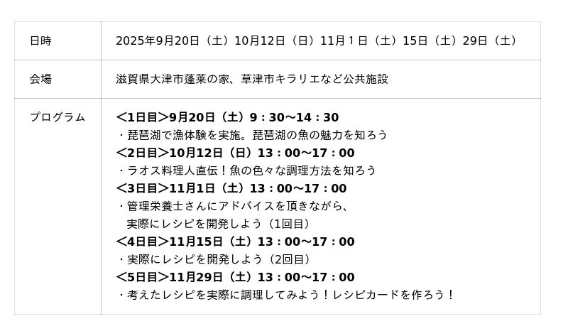 一般社団法人 海と日本プロジェクトin滋賀県は、高校生・大学生を対象にしたワークショップ「海と琵琶湖のさかなレシピチャレンジワークショップ」を、9月20日(土)10月12日(日)11月1日(土)
