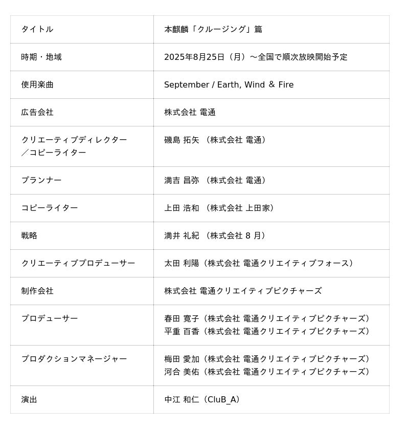 今回のTVCMでは、東京湾の美しい夕日を背景に、船上を舞台として江口洋介さんと広瀬アリスさんが共演。夕方のリラックスした時間に「本麒麟」を楽しむ自然な瞬間が描かれます。