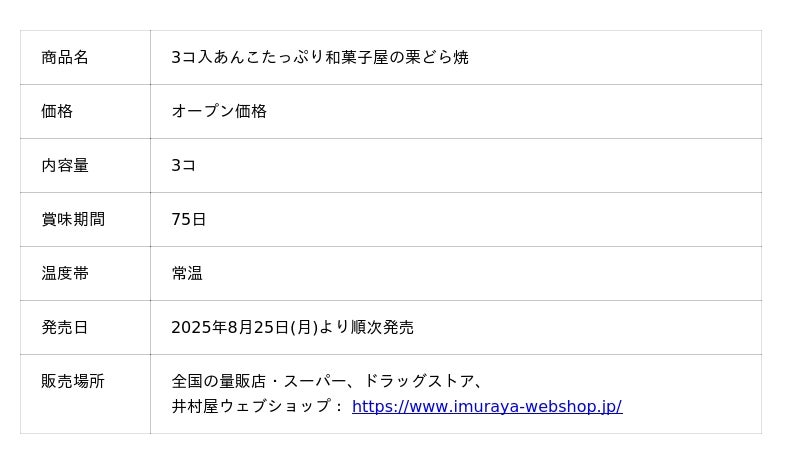 井村屋株式会社(本社:三重県津市高茶屋七丁目1番1号、社長:岩本 康)は、人気ブランド「あんこたっぷり和菓子屋のどら焼」シリーズの新商品として、『3コ入あんこたっぷり和菓子屋の栗どら焼』を2025年8月25日(月)より順次発売します。