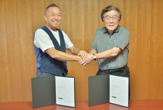 締結式の様子:日比谷花壇 宮島浩彰(左)/MPSジャパン 松島義幸(右)