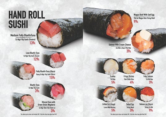 特に注目なのが、注文を受けてから目の前で仕上げる「ハンドロール寿司」(39,000ドン~ ※約219円~)。海苔は直前に炙られ、香ばしさとパリパリ感が口いっぱいに広がります。