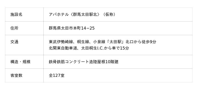 本ホテルは東武伊勢崎線「太田駅」北口から徒歩9分の立地で、北関東自動車道、太田桐生I.C.から車で15分とアクセス至便。自動車製造業を中心とした企業城下町であり、近隣には20を超える工業団地を有し、北関東最大の工業集積都市である。また、太田市はスポーツによる持続可能なまちづくりを掲げるほどスポーツにおいても盛んな地域であり、今後ビジネス、レジャー需要の更なる集客を狙う。