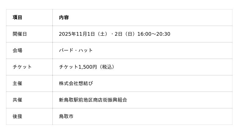 株式会社想結び(所在地:京都市上京区、代表取締役CEO:関春樹)は2025年11月1日(土)~11月2日(日)に鳥取駅を中心とした鳥取市中心市街地(バード・ハット)にて、「マーケット×街バル」をメインとした、買い物・飲食・文化・宿泊・交流が交差するイベントを開催します。2日にはナイトシアターも上映予定です。