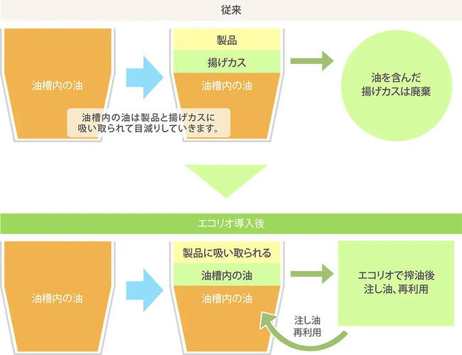 『エコリオ』はこの揚げカスに含まれる油を機械的に搾油するため、搾油した油は油槽の油と同じ品質になります。