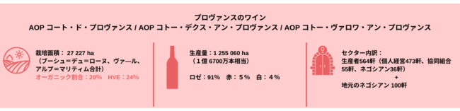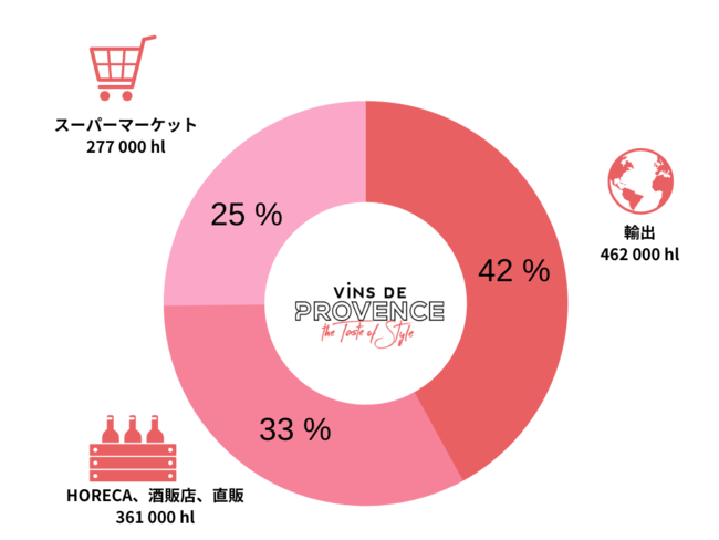 プロヴァンスワイン委員会(CIVP)によると、2021年のプロヴァンスのロゼワインの販売量は、飲食店・酒販店への販売量の増加に支えられコロナ前の水準を回復した。2021年、プロヴァンスのぶどう畑は大規模な山火事や霜の被害に見舞われたものの、収穫量は平年並みとなり最終生産量は1 255 060 hl(1億6700万本)と、過去5年の平均と同程度に着地した。
