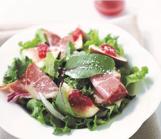 フランボワーズドレッシングのフルーティーで甘酸っぱい味わいに、燻製ハムとチーズの香りがアクセント。旬を迎えた無花果の上品な甘みを活かした、人気の高いサラダです。