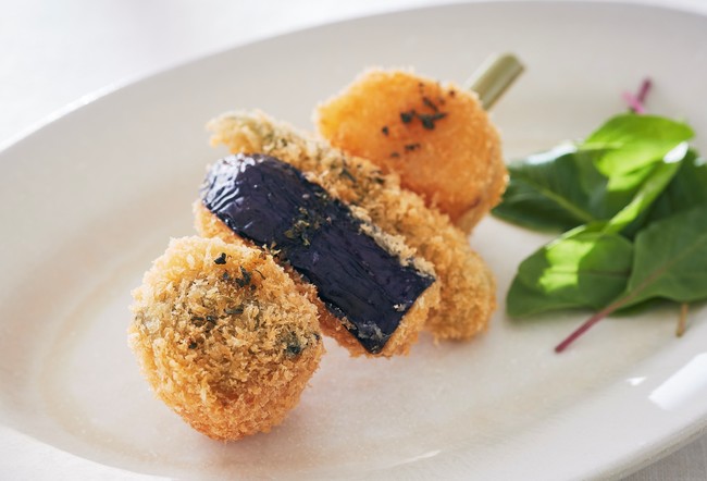 複数の素材を、手軽に美味しく食べられるよう串揚げに。タイム、オレガノ、バジルなどハーブの香りと塩をミックスした爽やかな塩味が、素材の味わいを引き立てます。