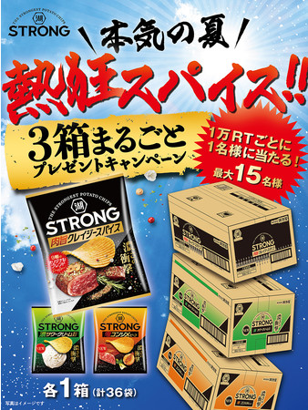 「湖池屋STRONG ポテトチップス 肉旨クレイジースパイス」の発売を記念して、当商品と「濃サワークリームオニオン」「鬼コンソメビーフ」をセットにして、各1箱(計3箱)をプレゼントするTwitterキャンペーンを実施します。尚、当キャンペーンは、リツイート数に応じて当選人数が増える形式(1万リツイート毎に当選者様1名増)となっておりますので、ぜひご参加ください。